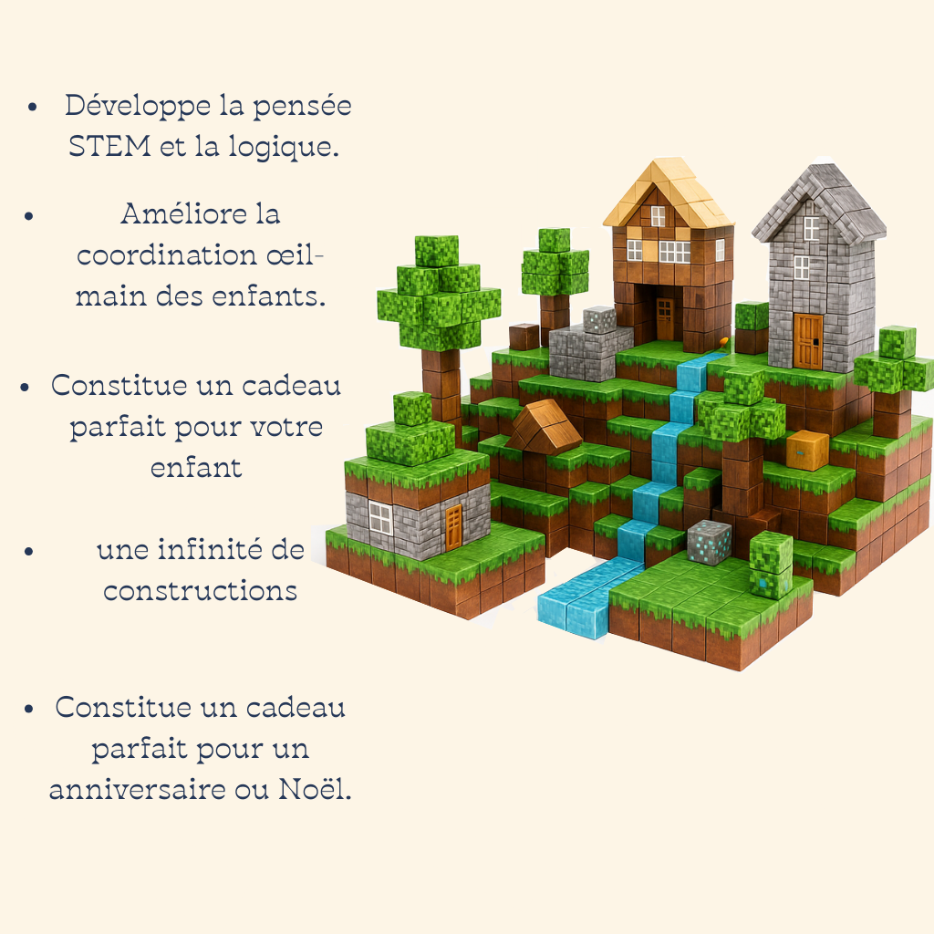 Les cubes magnétiques Minecraft transforment le jeu classique en une expérience immersive et éducative. Grâce à leurs aimants puissants, ces blocs s’assemblent facilement et permettent de reproduire un village complet, des maisons ou encore des arbres emblématiques de l’univers pixelisé. Plus qu’un simple jouet, c’est un véritable outil pour stimuler la curiosité et l’apprentissage des enfants.